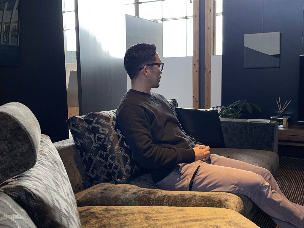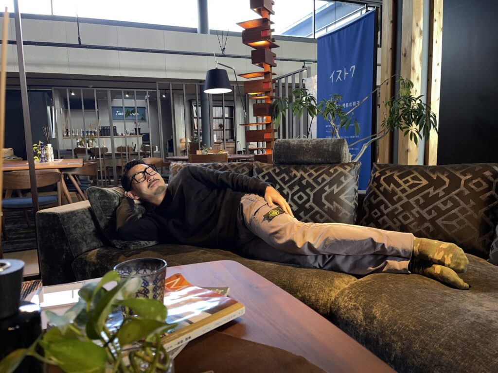 ソファの肘・背もたれ部分に腰をかけることができます。