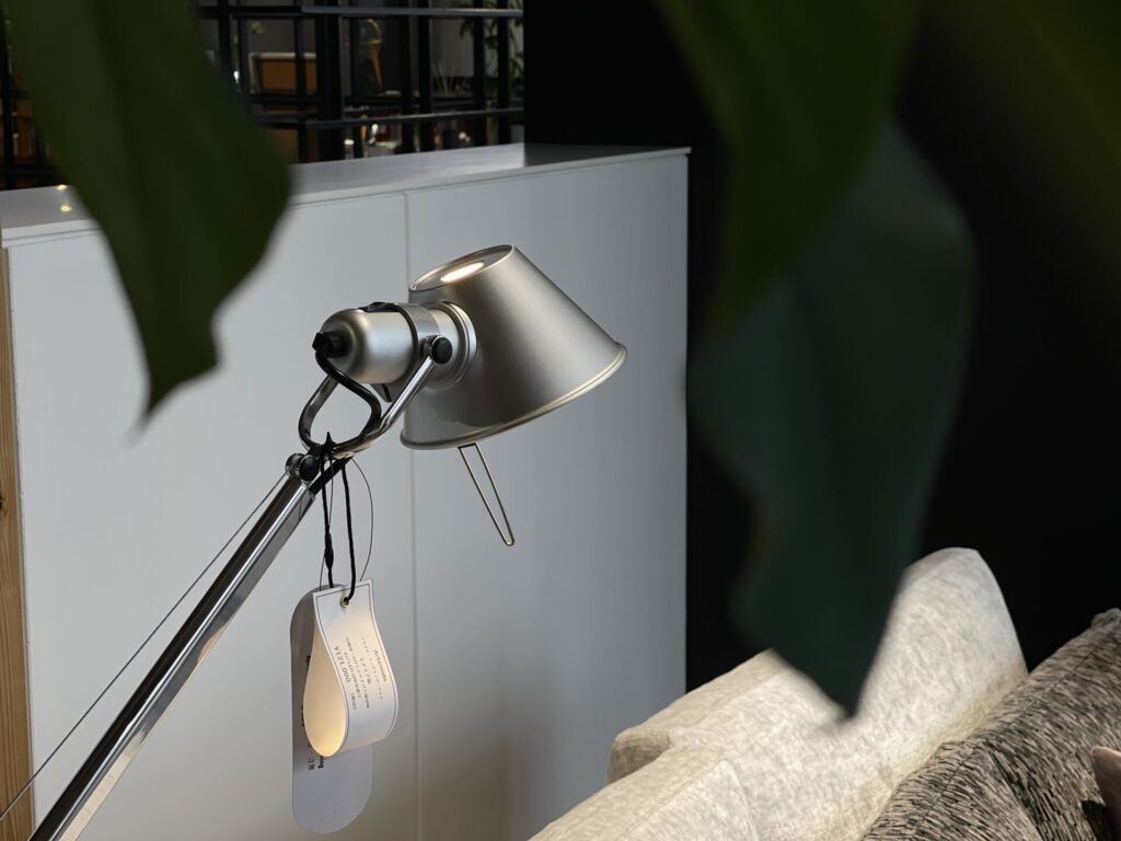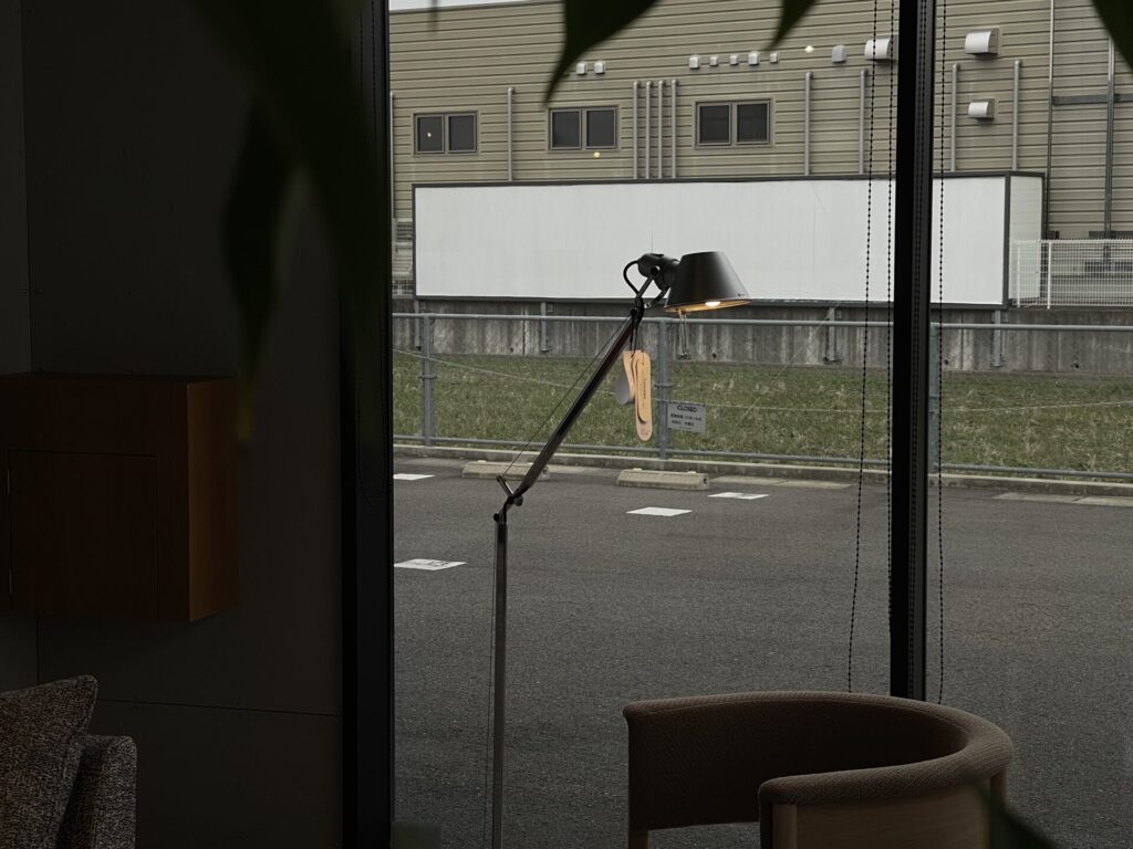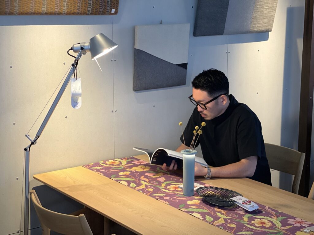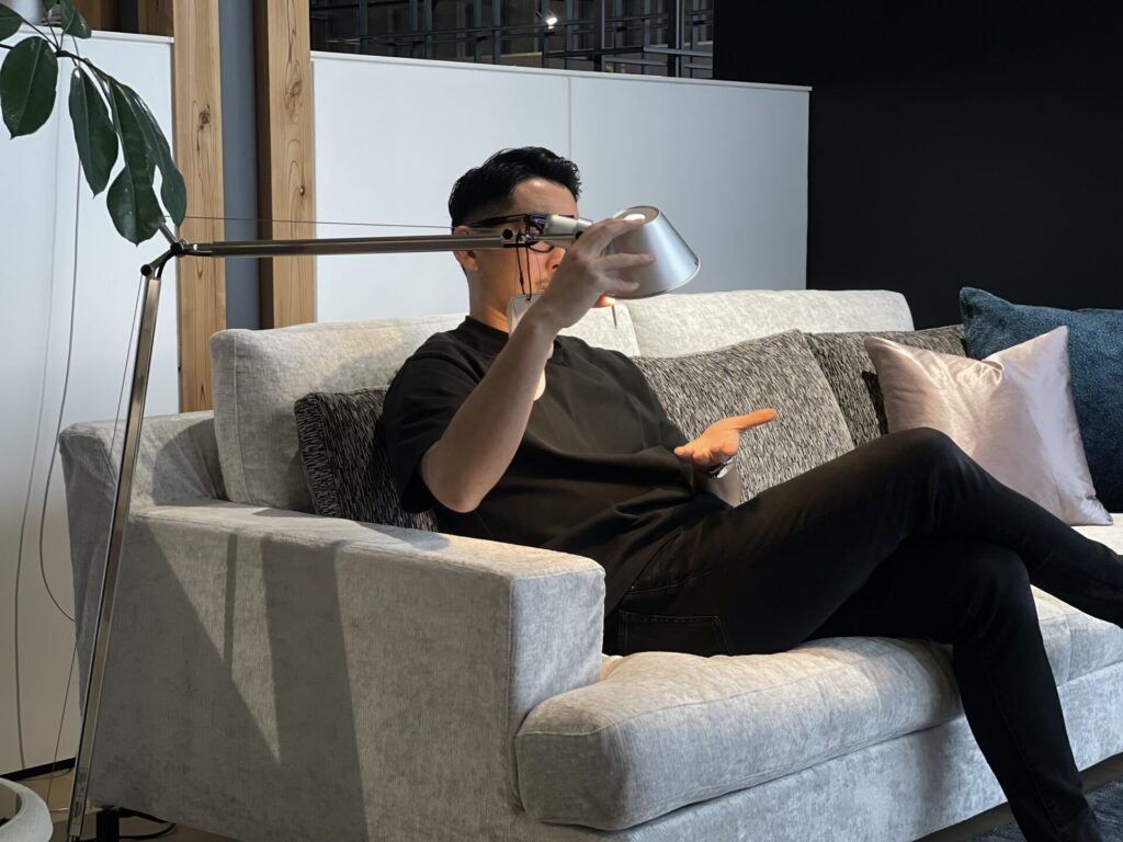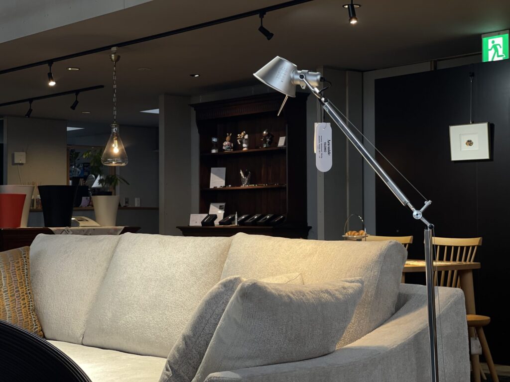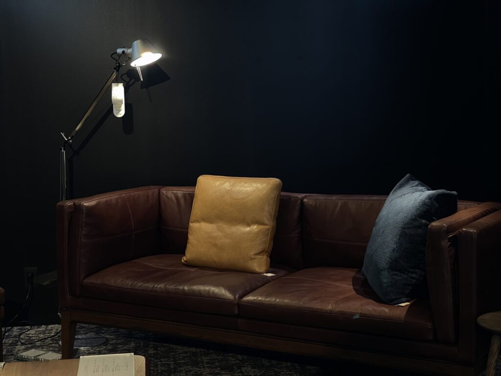 ソファサイドに置いたリーディングフロアの明かりのみを使用し
