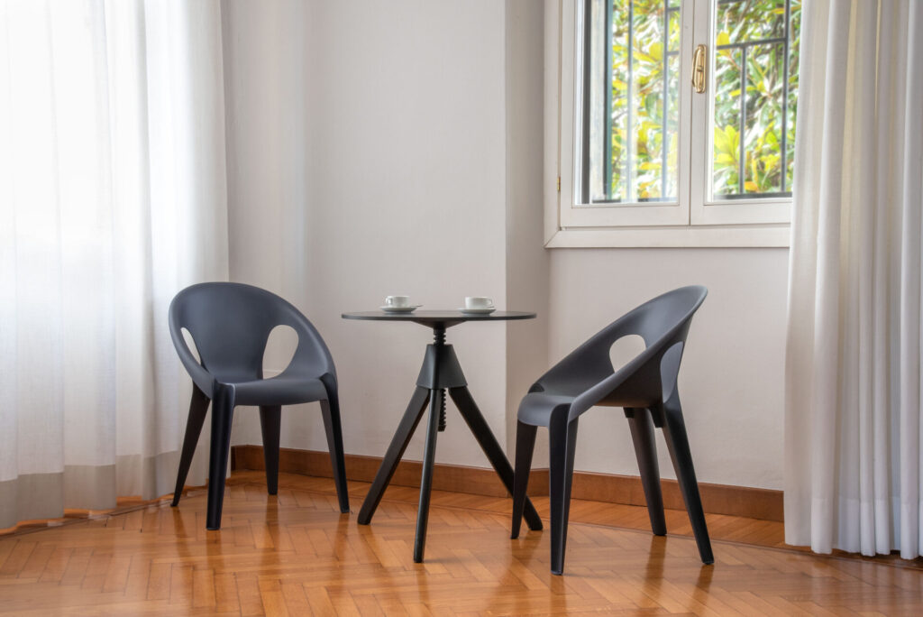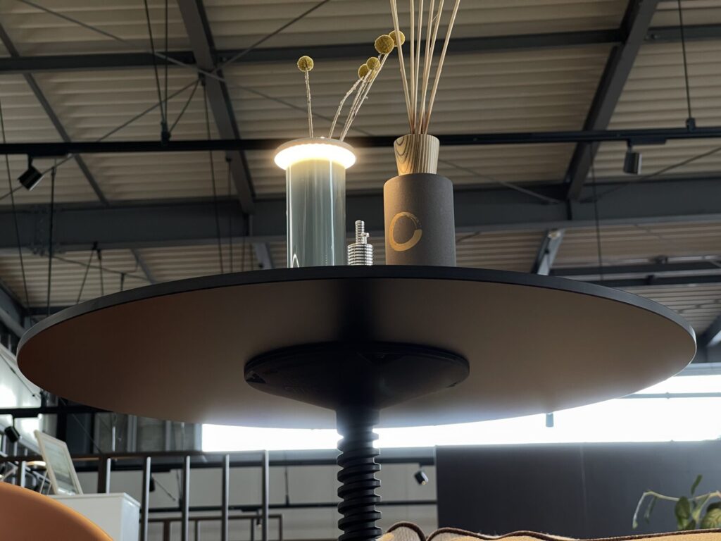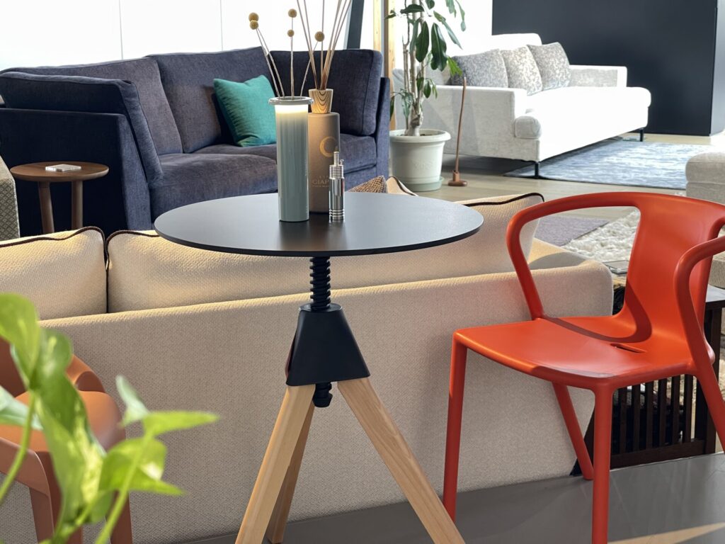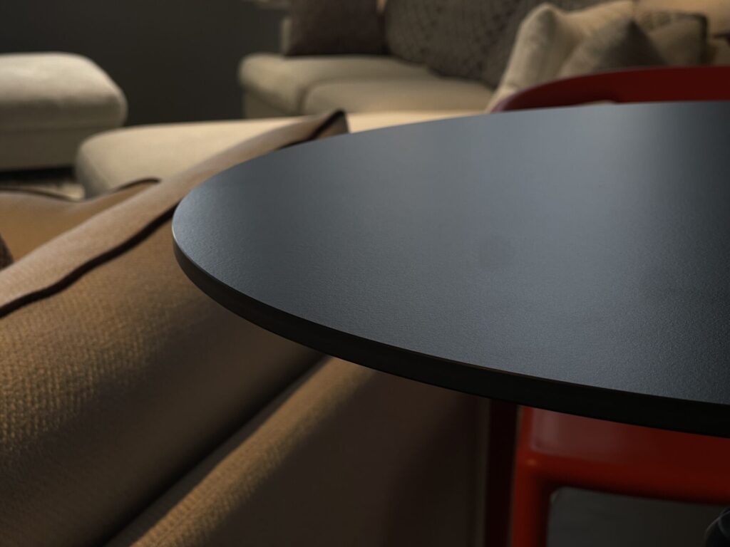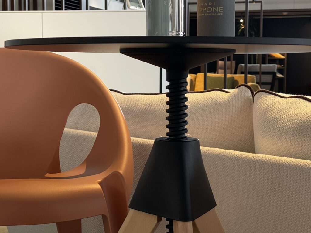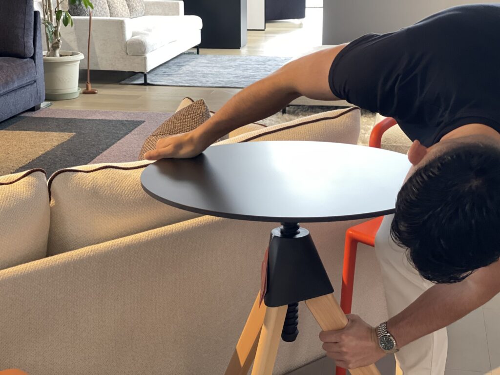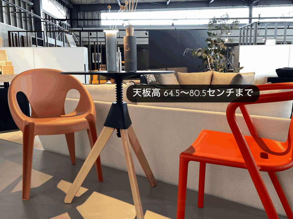 片手で脚部を抑え、反対の手で天板を回転させます。