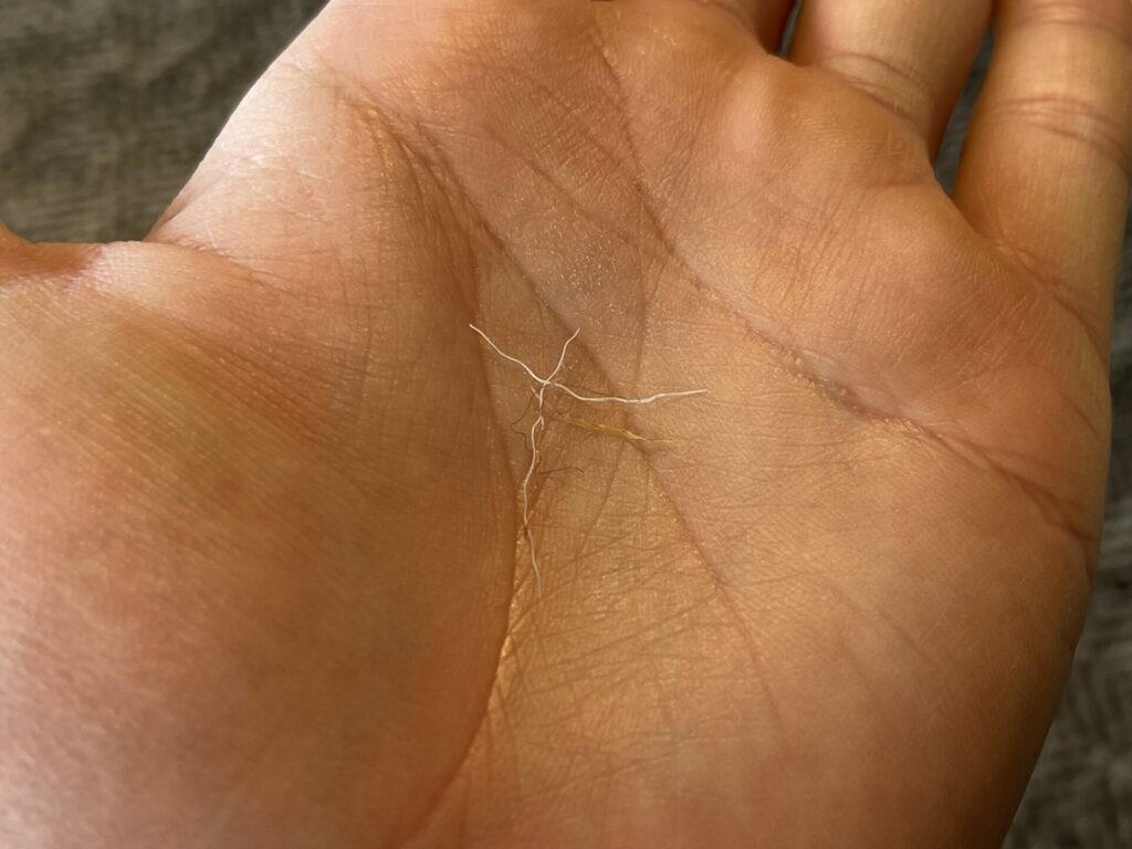 製造時に出た小さな糸屑や遊び毛がまだついていることが稀にあります。(今回は上記写真の量)