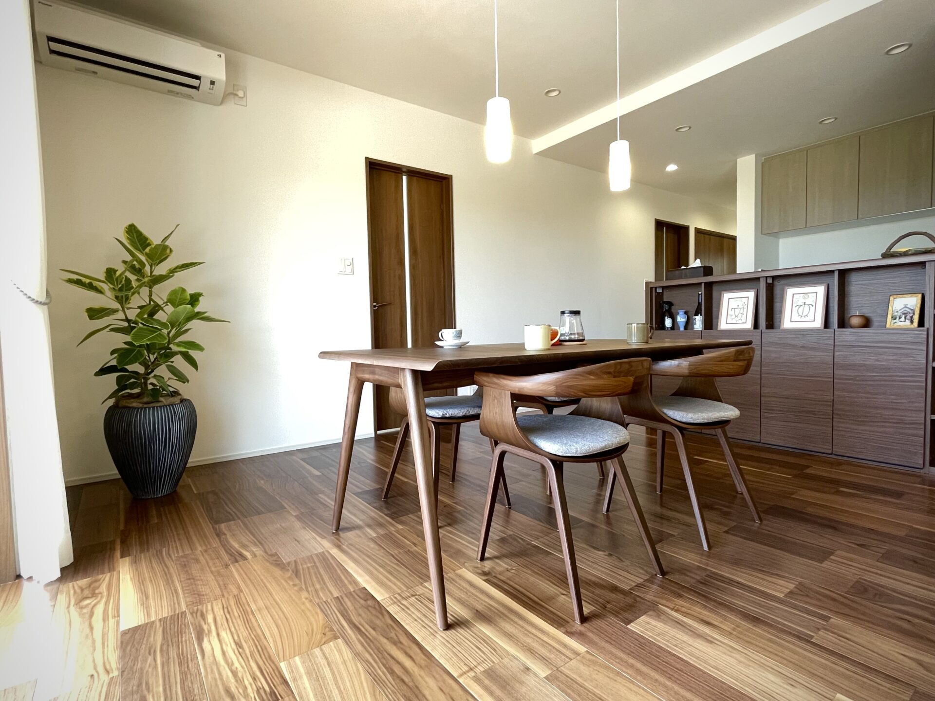 落ち着きを感じる空間はウォールナット材がメインに使用されていました。