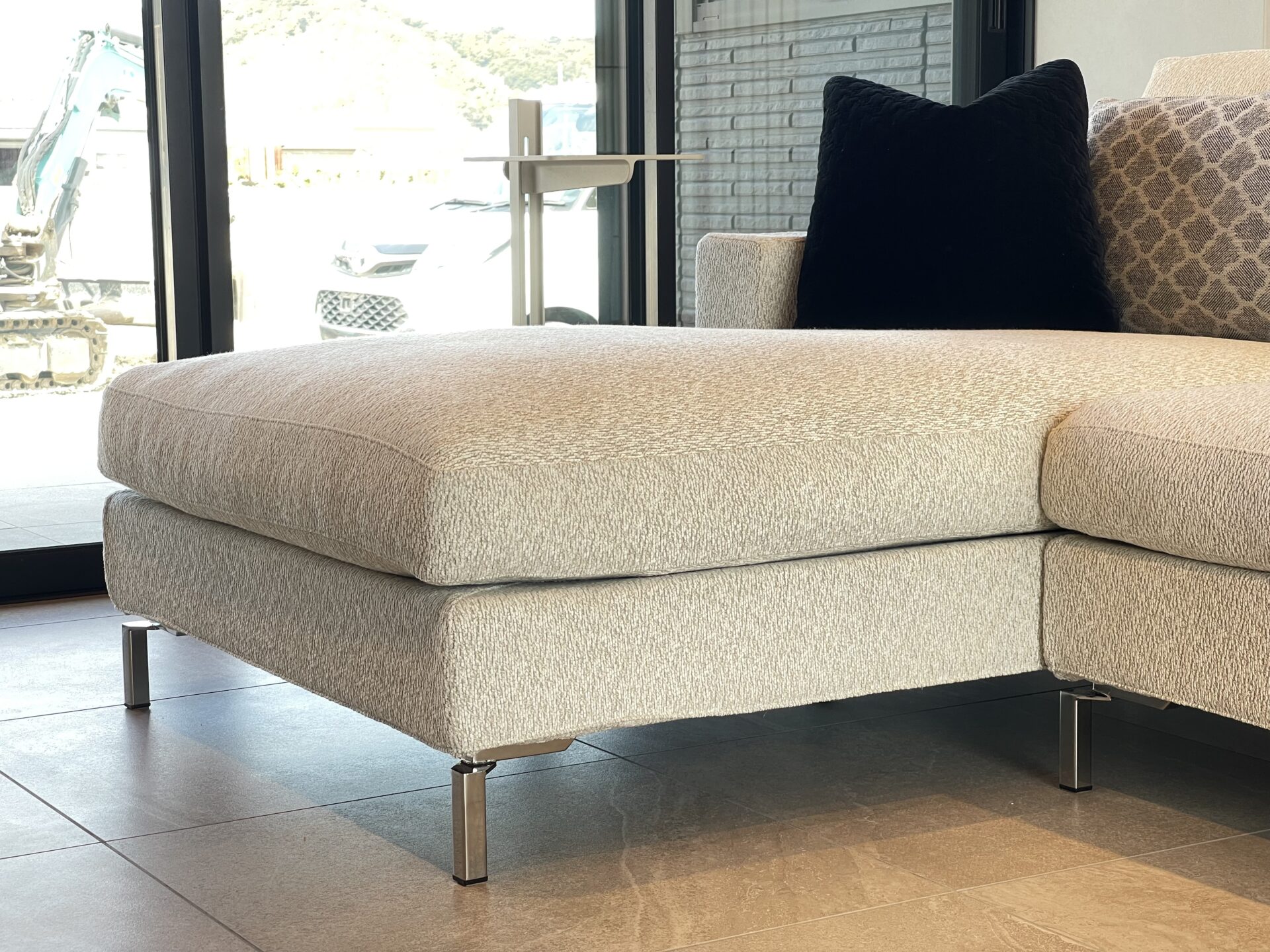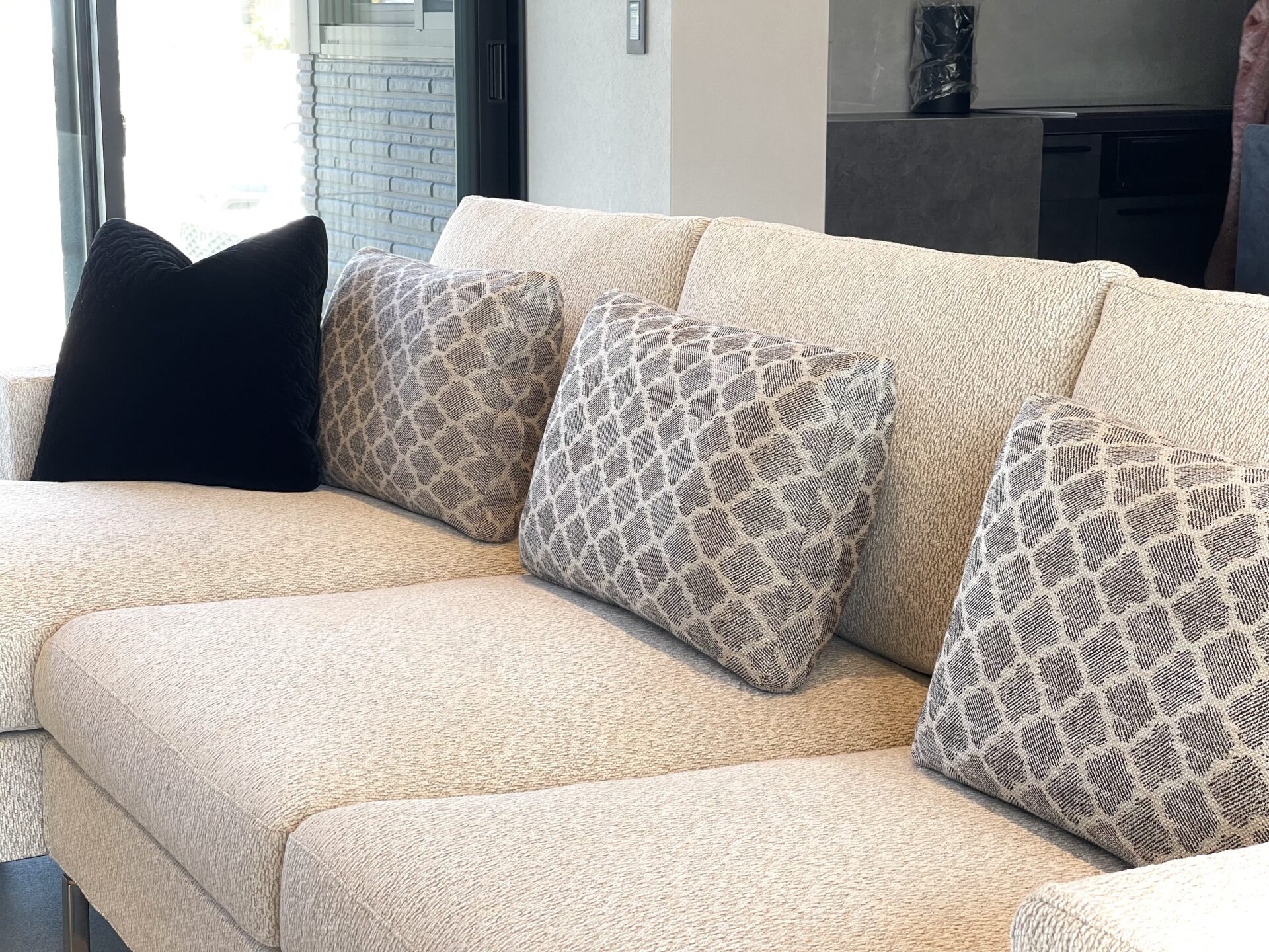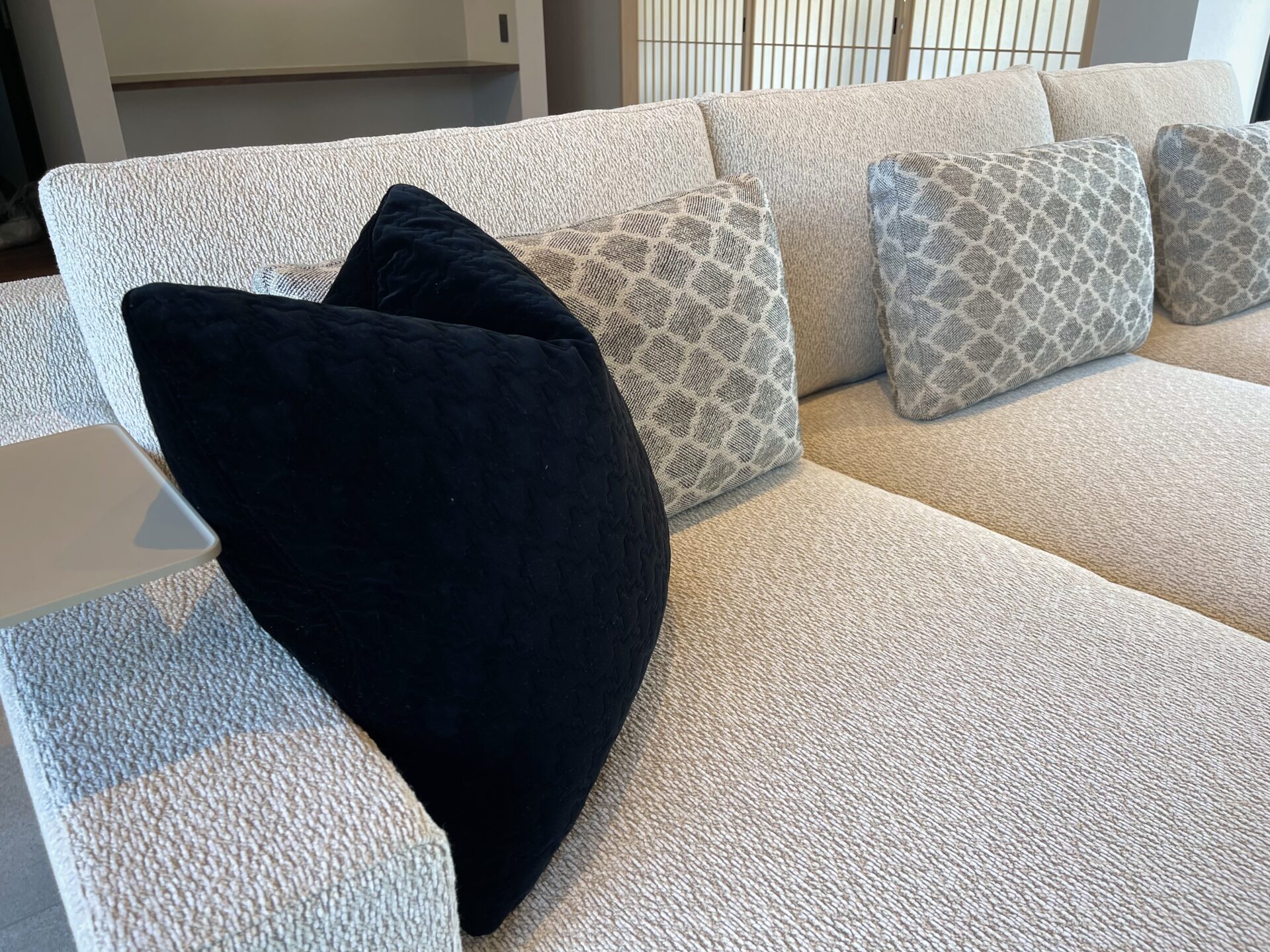 空間の中でソファの色味がリビングに溶け込みすぎないようマットブラックのピローで引き締めます。