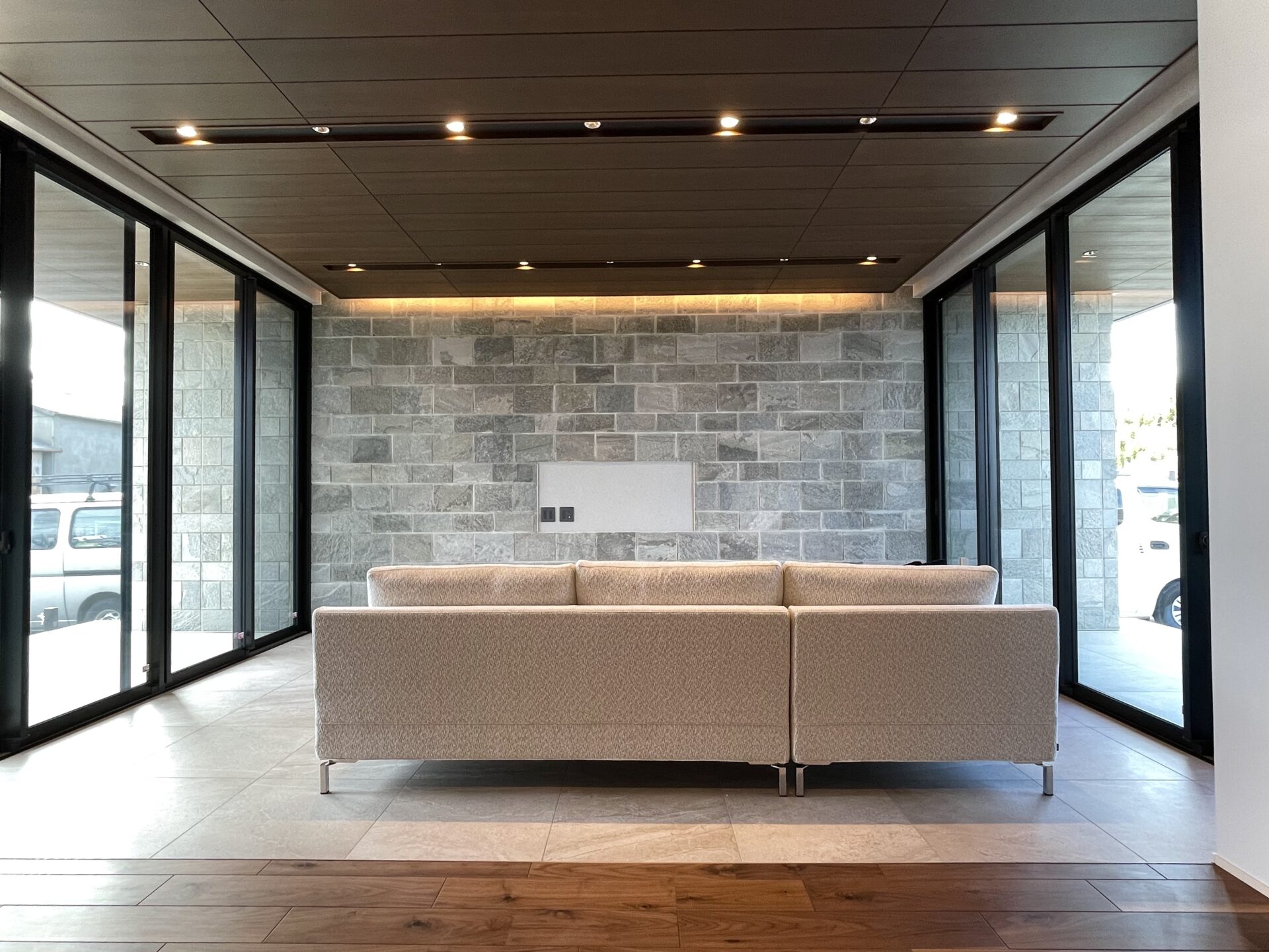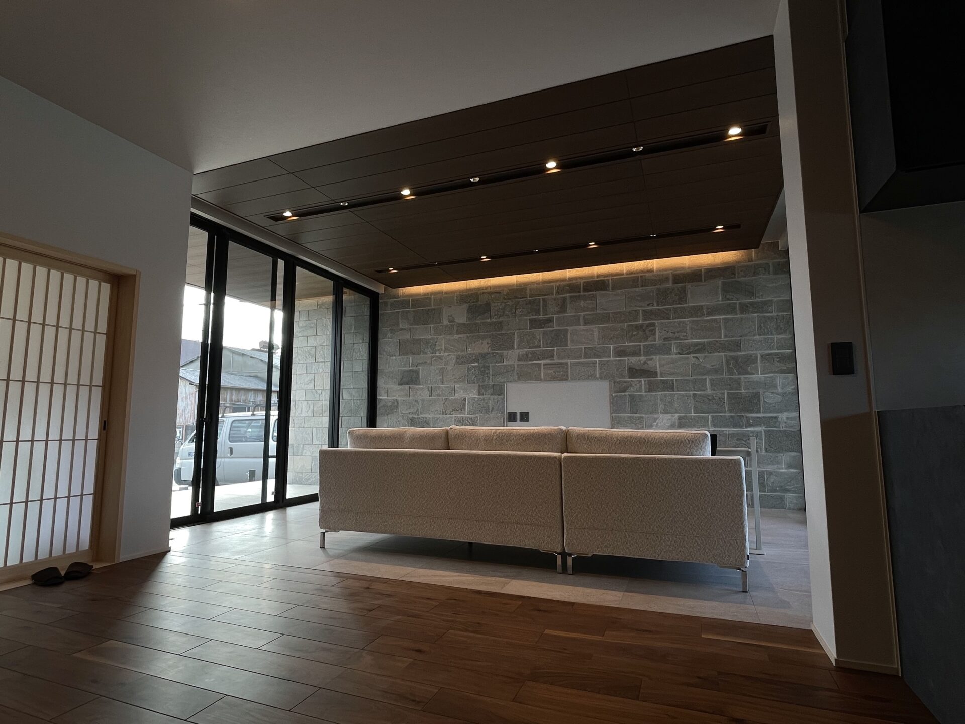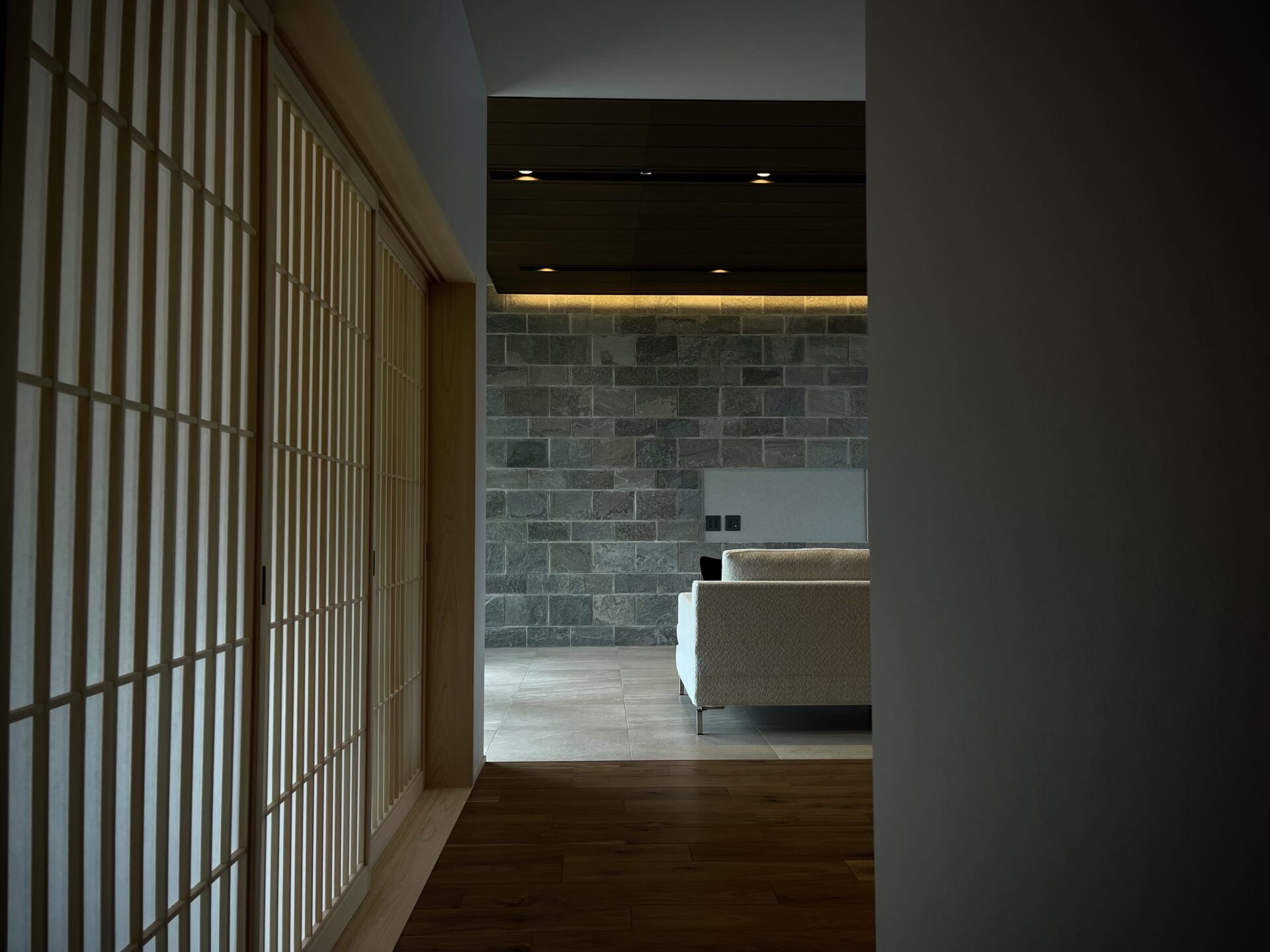 手前和室入り口の格子、床からTV壁面にかけて天然石材のグラデーション、奥行き感