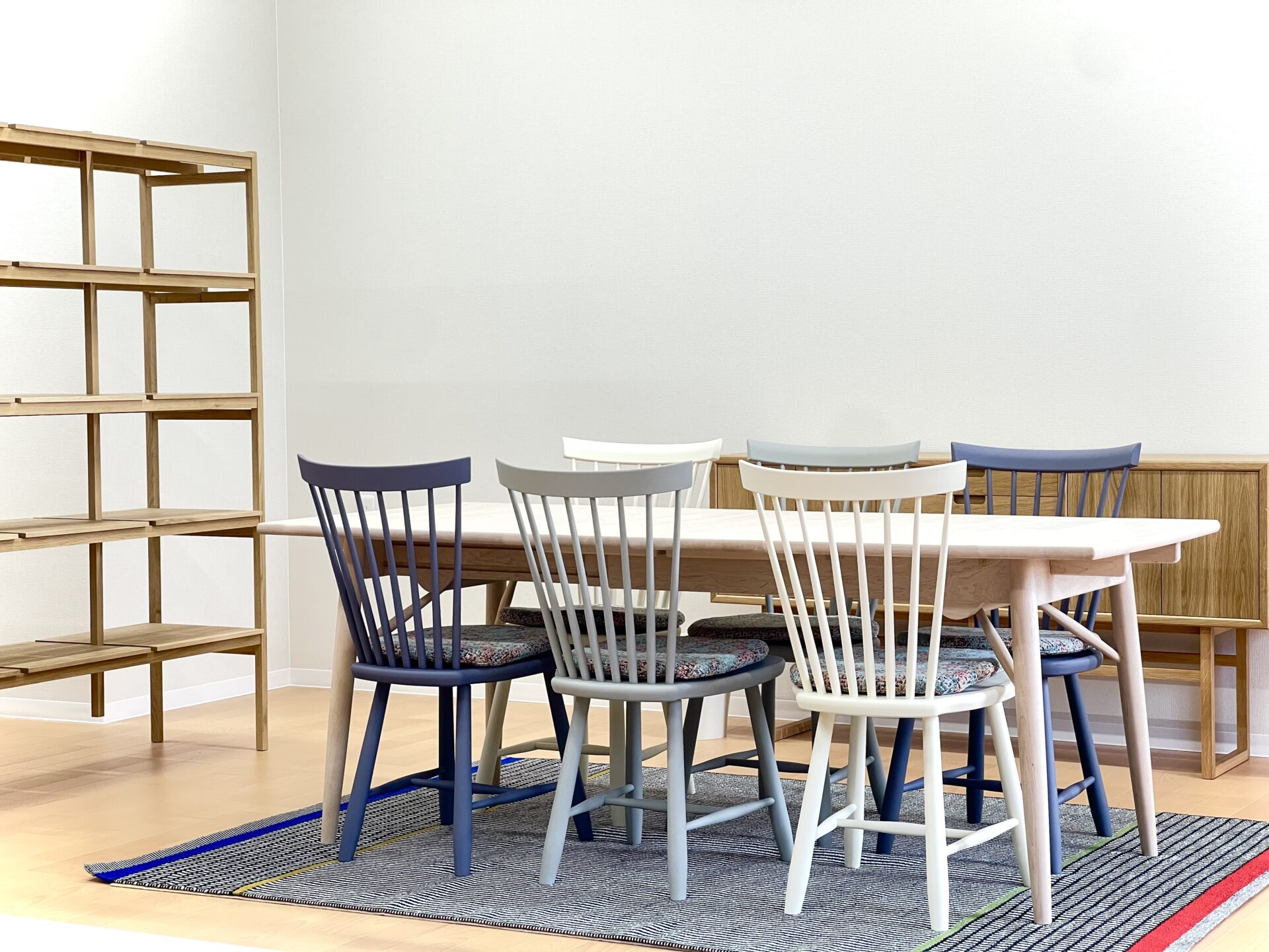 無骨で機械的なシステム家具ではなく、無垢材を使用した木の持つ柔らかい表情で落ち着けるコーディネートを目指しています。